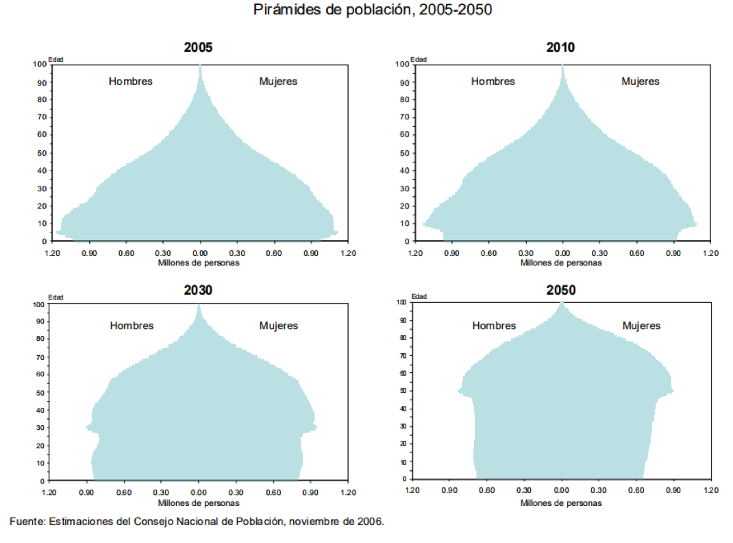 Hoy 6 de cada 100 mexicanos son mayores de 65 años. Misma proporción que se está viendo afectada debido a diferentes factores. A continuación pueden observar una grafica publicada por la INEGI en noviembre de 2006, con una estimación sobre el comportamiento poblacional en México de los siguientes 30 años.